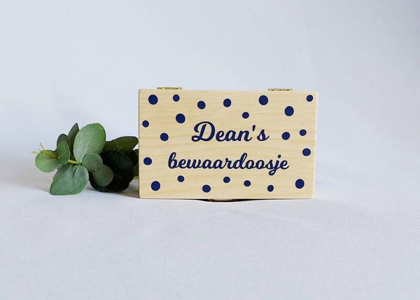 In dit bewaardoosje kun je de eerste en belangrijke spulletjes van je kleintje bewaren. Er past een haarlokflesje, tandendoosje en navelklemmetje in. Daarnaast is er ook nog ruimte voor bijvoorbeeld een echofoto of speentje.